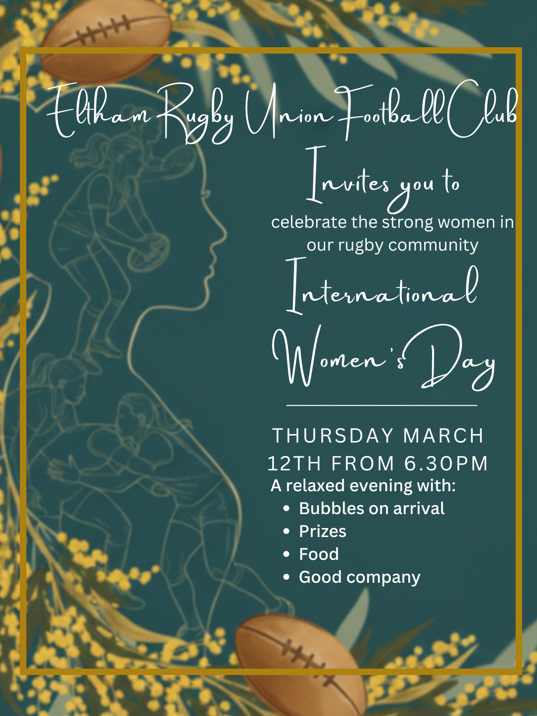 Eltham Rugby 58 Bridge St, Eltham, VIC, AustraliaCelebrating Our Eltham Women Join us for a relaxed evening at the clubhouse as we recognize International Women’s Day and the many women who contribute to Eltham RUFC. From the families on the sidelines to the volunteers behind the scenes, this is a night to appreciate everyone who helps make our club a welcoming home.…