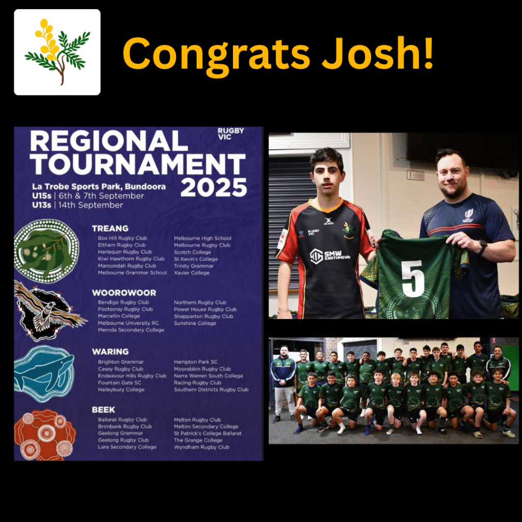 One of our long-standing junior players, Josh Stivala was selected to play in the Rugby Victoria U13s Boys Regional Tournament last month.Β The tournament comprised four teams, made up of players from club and college teams in four zones across the greater Melbourne area.Β Each team had a first nations name reflecting themes of their zone, and Josh was selected into the Treang team (meaning East/Tree).Β