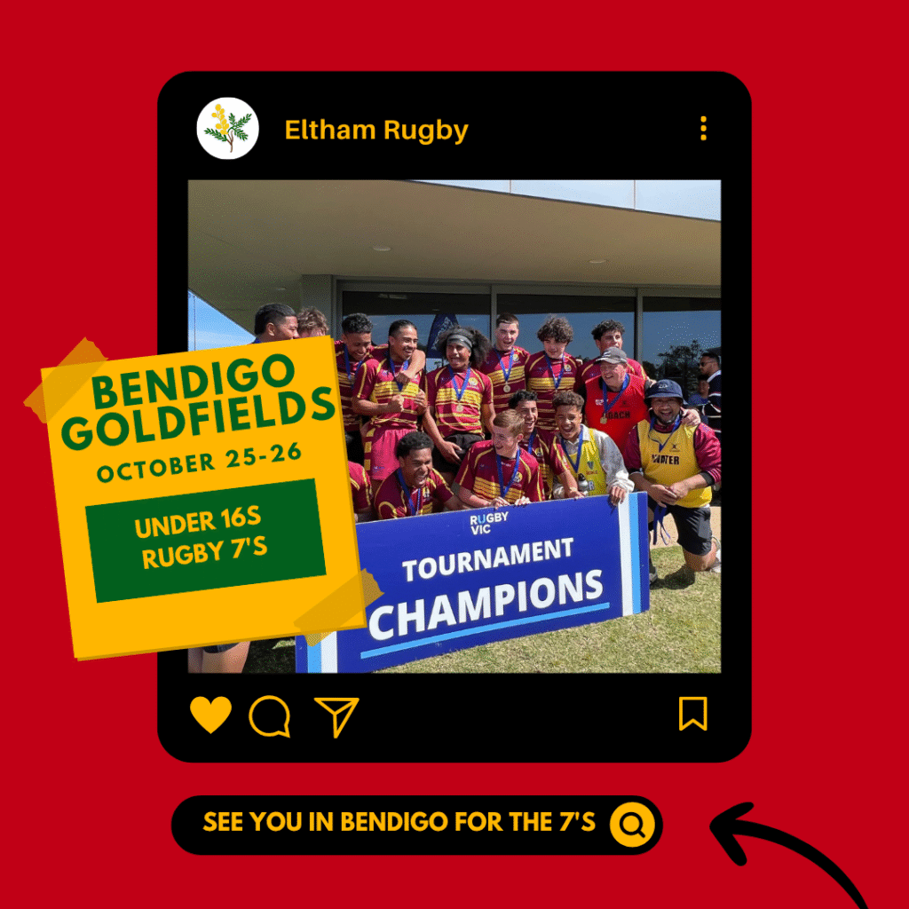 That post-season slump is well and truly over with an exciting Rugby 7s tournament coming up – the Bendigo Goldfields 7s Test is taking place on 25-26 October in Bendigo and Eltham is fielding an U16 team again this year.Β